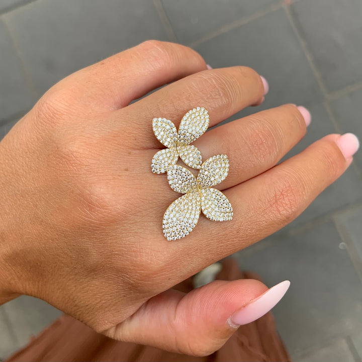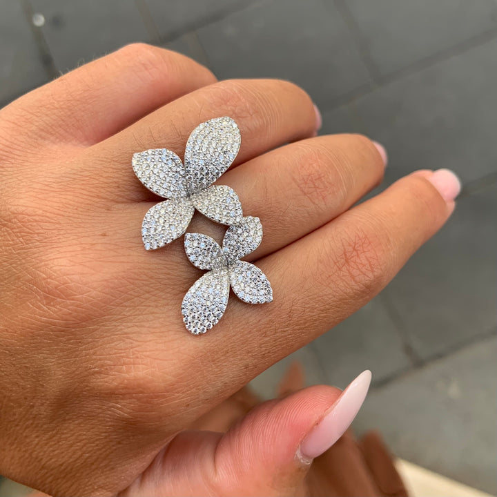 Anello doppio fiore a 4 petali (dimensione totale 4,5 cm circa).