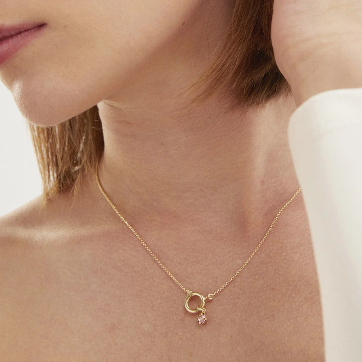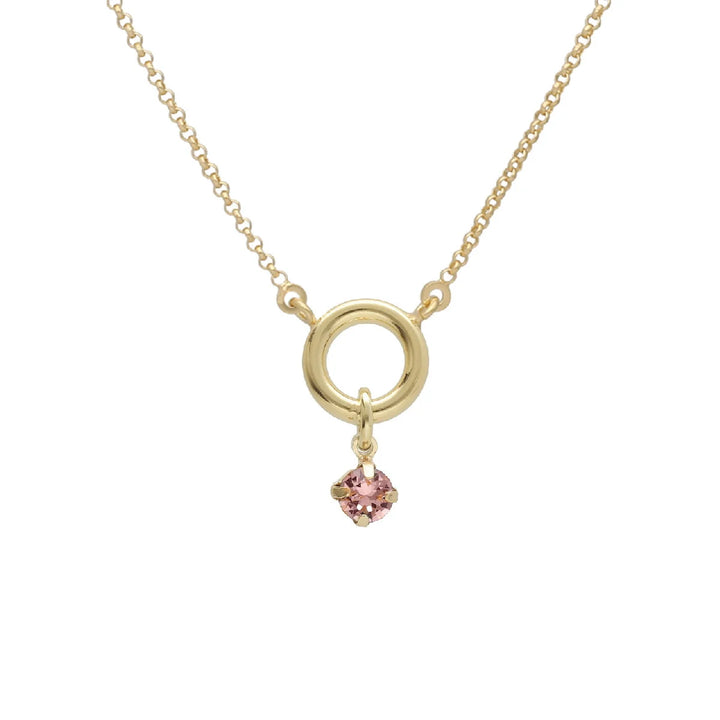Collana dorata con cerchio e cristallo pendente.