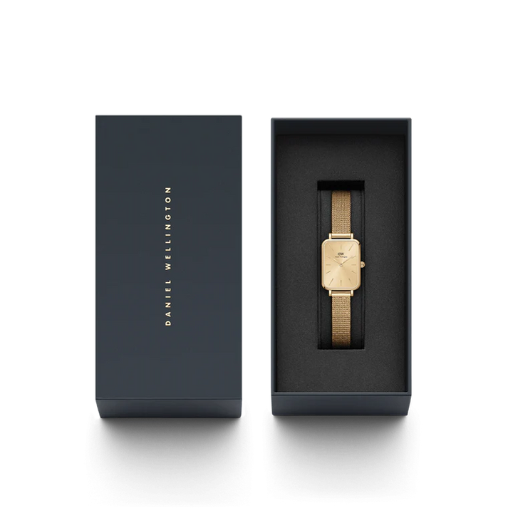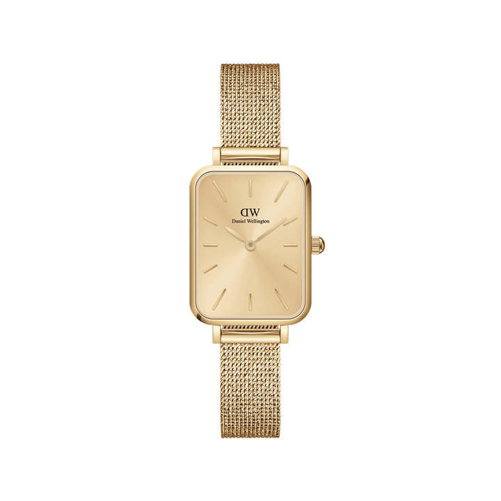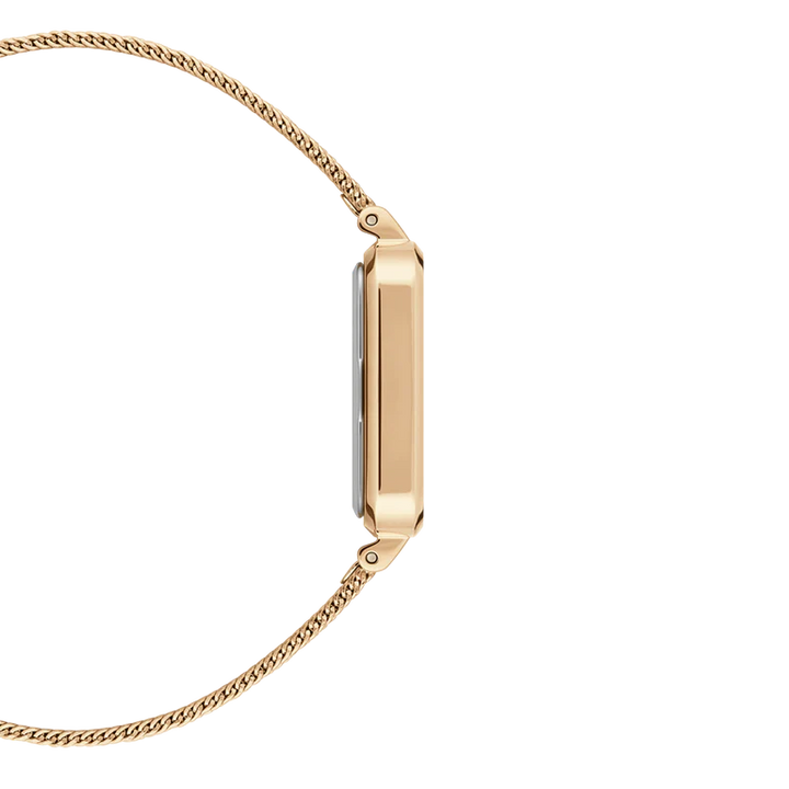 Il delicato cinturino in rete dorata scintilla di gusto mentre sostiene il quadrante rettangolare con bordi arrotondati e snelli.